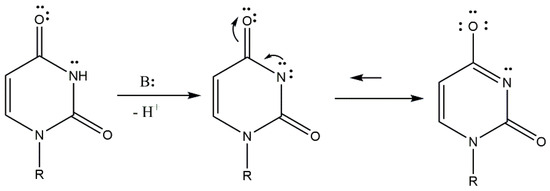 At high pH values, when a proton from -N(3)H is deprotonated, lactam–lactim tautomerism occurs due to the alkaline medium. As a result of tautomerism, the free electron pair from the nitrogen atom migrate, causing the formation of a double bond between the C4 carbon atom and the nitrogen atom. The formation of the double bond causes an electron pair to leave the bond between the carbon atom C4 and the oxygen atom and migrates this pair to the oxygen atom (Figure 3).