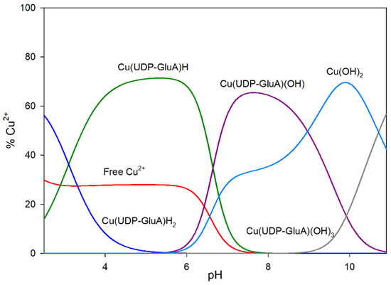 The simple form of Cu(UDP-Glc) and the hydroxocomplex Cu(UDP-Glc)(OH)2 are most likely formed in the system under study at very low concentrations, which did not allow their identification during potentiometric tests and computer analysis.