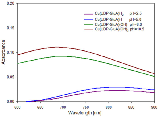 The change in the internal coordination sphere in complexes containing copper (II) ions is associated with a shift in absorbance towards lower wavelengths (Figure 5). For the Cu(UDP-GluA)H2 and Cu(UDP-GluA)H complexes, coordination occurs through one oxygen atom derived from the glucuronic acid moiety or phosphate group. With increasing pH values, nitrogen in the UDP-GluA molecule is deprotonated and a coordination bond is formed with this donor atom. For the Cu(UDP-GluA)(OH) complex, coordination occurs through a nitrogen atom derived from the UDP molecule and two oxygen atoms derived from the glucuronic acid molecule and phosphate group of the UDP molecule. The internal coordination sphere of the last complex form from the studied system includes a nitrogen atom N(3) derived from the UDP molecule and three oxygen atoms derived from carbonyl group -COOH of glucuronic acid and two phosphate residues -O-PO3H.