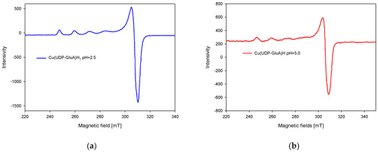 On the basis of EPR spectra analysis, the formation of monomeric complex forms in the studied system was confirmed, and characteristic spectra for copper (II) ions were observed (Figure 6). The spectral parameters gǁ = 2.39 and Aǁ = 136 × 10−4 cm−1 for the Cu(UDP-GluA)H2 complex and gǁ = 2.37 and Aǁ = 145 × 10−4 cm−1 for the Cu(UDP-GluA)H complex indicate the participation of one oxygen atom in the formation of the coordination bond. The EPR spectra obtained are analogous due to the similar coordination mode in the compounds analyzed.