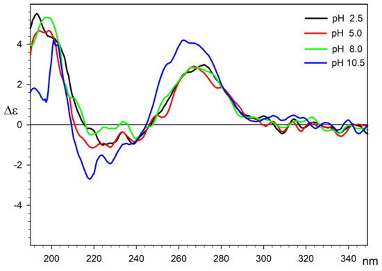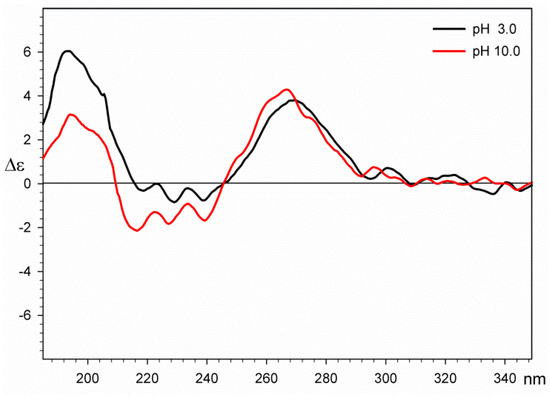 The first series of CD measurements was carried on uridine-5′-diphosphoglucuronic acid at different pH values to exclude protonation/deprotonation effects on the conformation of the ligand. Based on the results of potentiometric studies, pH 3.0 and 10.0 were chosen. The results of these measurements show that there is no significant change in CD spectra in the range of 250–280 nm, which originates from the absorption of the uridine base. The maximum observed for the acidic solution is Δε = 3.81 at 269 nm and Δε = 4.29 at 266 for the basic one. In the short-wave part of the spectra, a negative Cotton effect can be observed for the sample in the basic solution. This result is usually related [34,35] to the deprotonation of chiral carboxylic acid, which shifts the n-π* transition and CD maxima towards shorter wavelengths (Δε = −0.84 at 228 nm for the acidic solution nm and Δε = −2.14 at 216 nm for the basic one). The loaded CD spectra for both solutions are presented in Figure 7 and indicate that the conformation of uridine-5′-diphosphoglucuronic acid is not pH-dependent in water solutions.