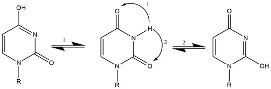 Nucleic acid bases can exist in several different forms of tautomerism. In molecules of nucleic acid bases, keto-enol and amino-imino tautomerism can occur. The formation of tautomeric forms is related to the presence of protons capable of migration in the molecules of these organic substances. The appearance of tautomeric forms is important, e.g., in pharmacy, chemistry, and physics. In addition, the formation of different tautomeric forms can influence the structural and chemical diversity of these compounds and thus their biological function. Therefore, replacing one nuclear base with its tautomer can result in an incorrect base pair, causing an error in the genetic code or a mutation [22,23,24].
