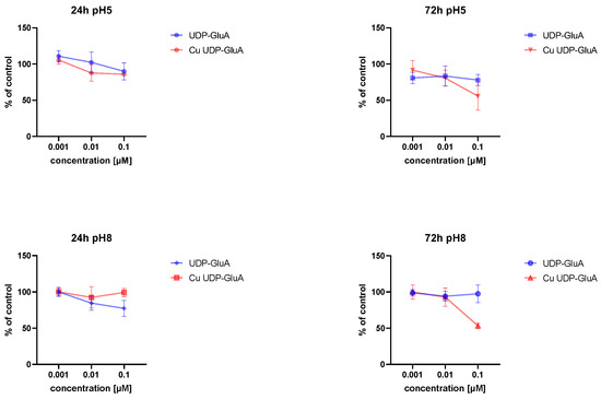 In turn, after 72 h of incubation with UDP-GluA at pH 8, no changes in the cells’ metabolic activity could be detected; therefore, the IC50 value could not be calculated. Cu(UDP-GluA) at pH 8 after 72 h of incubation reduced the A459 cell’s metabolic activity by 52.2%. However, the effect was strongly time-dependent (Table 6).
