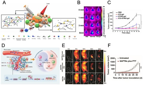 The principles and results of two synergistic therapies of photothermal therapy and STING agonist and their effect on tumor in vivo. (A) Schematic illustration of a synergistic therapy of the photothermal transduction agent Indocyanine green (ICG) with the STING agonist DMXAA [30]. (B) Temperature development after the injection of ICG of different forms in vivo, the color represents different temperature, and have been shown in the legend [30]. (C) Tumor growth in vivo after photothermal therapy and a STING agonist alone and synergistic therapy. * p < 0.05 vs. control, *** p < 0.001 vs. control [30]. Copyright 2023 American Chemical Society. (D) Schematic illustration of a synergistic therapy of the photothermal transduction agent croconaine dye with the STING agonist diABZIs using SAPTNs [60]. (E) The images of drug distribution in vivo after the injection of SAPTNs with irradiation alone or with irradiation and the myeloperoxidase inhibitor PF1355, the color represents different temperature and the connection can be seen in the legend [60]. (F) Average volume of tumor reinjected in vivo after no treatment in the untreated group and SAPTNs plus PTT group treated by a synergistic therapy of PTT and a STING agonist using SAPTNs. *** p < 0.001 vs. control [60]. Copyright 2024 John Wiley and Sons.
