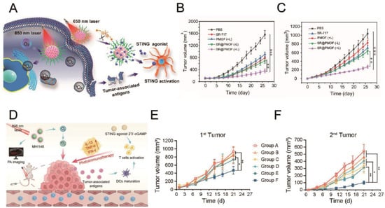 The principle and result of two synergistic therapies of photodynamic therapy and STING agonist on primary tumors and distant tumors in vivo. (A) Schematic illustration of a synergistic therapy of the photosensitizer Meso-tetra(carboxyphenyl) porphyrin (TCPP) and STING agonist SR-717 [96]. Volume growth of a primary tumor (B) and distant tumor (C) when treated with a photodynamic material polymeric metal−organic framework (PMOF) and SR-717 alone and a synergistic therapy of PDT and a STING agonist by using a nanoparticles called SR@PMOF combining PMOF and a STING agonist (SR-717), without light irradiation (-L) or with light irradiation (+L). ** p < 0.01 vs. control, *** p < 0.001 vs. control [96]. Copyright 2023 American Chemical Society. (D) Schematic illustration of a synergistic therapy of a nanoparticle named GM@P, consisting of a hydrophobic shell encapsulating the photosensitizer MHI148 and the STING agonist 2′3′-cGAMP [31]. Tumor growth of primary tumors (E) and distant tumors (F) after photothermal therapy using a nanoparticle with MHI148 (M@P) alone without irradiation (Group B: M@P), with irradiation (Group D: M@P + light irradiation), with a free STING agonist and irradiation (group E: M@P + light irradiation + 2′3′-cGAMP), a STING agonist alone (Group C: 2′3′-cGAMP), and a synergistic therapy of GM@P (Group F: GM@P + light irradiation) and a control group (Group A). * p < 0.05 vs. control, ** p < 0.01 vs. control [31]. Copyright 2024 American Chemical Society.