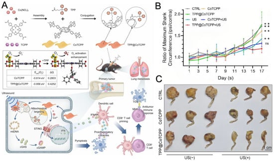 The principle of a synergistic therapy of sonodynamic therapy and a cGAS-STING agonist using a material consisting of triphenyl phosphonium (TPP) and sonodynamic cobalt organic frame-work nanosheets (TPP@CoTCPP) and some experimental results. (A) Graphic illustration of TPP@CoTCPP [111]. (B) Comparison of the volume of ipsilateral and contralateral tumor in vivo in different groups treated by sonodynamic therapy and a STING agonist alone and a synergistic therapy of sonodynamic therapy and a cGAS-STING agonist. ns indicates not significant, ** p < 0.01 vs. control [111]. (C) Tumor volume of sonodynamic therapy alone and synergistic therapy [111]. Copyright 2023 Elsevier.