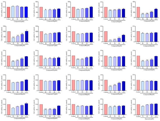 The cytotoxic effects of compounds (1–24) on the RAW 264.7 macrophage cells. Values are the mean ± SEM, n = 3. (Compared to the control group *** p < 0.001, ** p < 0.01, or * p < 0.05).