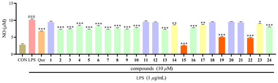 The inhibitory effects of 1–24 against LPS-induced NO production in RAW264.7 macrophages. Mean ± SEM of three replicates is shown. * p < 0.05, ** p < 0.01, *** p < 0.001 with the LPS group. ### p < 0.001 with the CON (control) group.