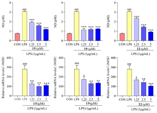 Concentrations of NO and mRNA expression of iNOS in RAW 264.7 cells treated with compounds 15, 19, and 22. Values are the mean ± SEM, n = 3. (Compared to the control group ### p < 0.001. Compared to the LPS group, *** p < 0.001, ** p < 0.01, or * p < 0.05).