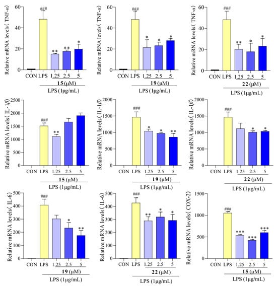 mRNA expression of pro-inflammatory cytokines TNF-α, IL-1β, and IL-6 in RAW 264.7 cells treated with compounds 15, 19, and 22. Values are the mean ± SEM, n = 3. (Compared to the control group ### p < 0.001. Compared to the LPS group, *** p < 0.001, ** p < 0.01, or * p < 0.05).