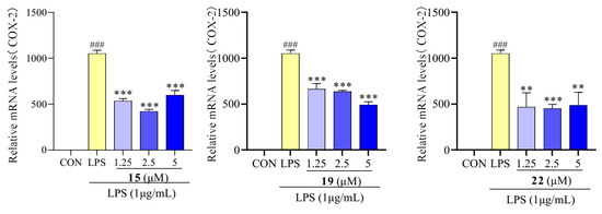 COX-2 mRNA expression in RAW 264.7 cells treated with compounds 15, 19, and 22. Values are the mean ± SEM, n = 3. (Compared to the control group ### p < 0.001. Compared to the LPS group, *** p < 0.001 or ** p < 0.01).