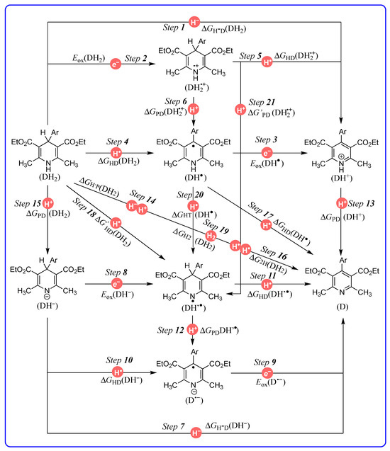 | Step 6 | DH2•+ → DH• + H+ | ΔGPD(DH2•+) | ΔGPD(DH2•+) = ΔGHD(DH2) − F[Eox(DH2) − Ered(H+)] | (4) |