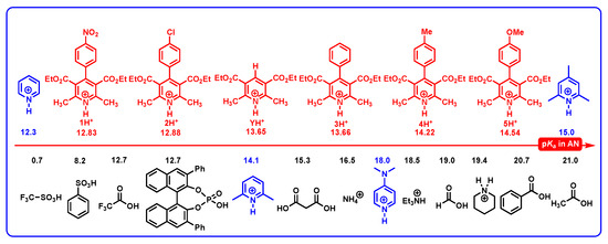 What is more, several interesting conclusions could be drawn from Figure 4. (1) Since the pKa of BINOL-derived phosphoric acids (BPA) are reported as 12–14 in MeCN [46,47,48,49], DH+ (12.83–14.54) have comparable acidities to BPA. (2) DH+ (12.83–14.54) generally belongs to medium–strong organic acids, which could be applied in acid-catalyzed chemical reactions. (3) The acidity of 3H+ (13.66) is almost equal to that of YH+ (13.65), and when the 4-phenyl group of DH+ is substituted by an electron-withdrawing group, the acidity of new DH+ is stronger than 3H+ (13.66) or YH+ (13.65). In contrast, if the 4-phenyl group of DH+ is substituted by an electron-donating group, the acidity of new DH+ is weaker than 3H+ (13.66) or YH+ (13.65). (4) Sometimes, after DH2 are oxidized by hydride acceptors, the acidities of resulting DH+ should be considered when the organic bases are involved in the reaction system. (5) D (pKa(DH+) = 12.83 − 14.54) could be used as alternative organic bases of pyridine (pKa of conjugate acid is 12.3) [43,44,45], 2,6-trimethylpyridine (pKa of conjugate acid is 14.1) [43,44,45], and 2,4,6-trimethylpyridine (pKa of its conjugate acid is 15.0) [43,44,45] in acetonitrile.