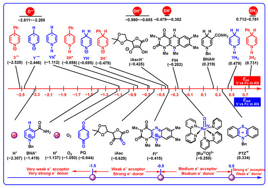 To clearly compare the electron-donating properties of DH2 and related intermediates (DH−, DH•, and D•−), the oxidation potentials (Eox vs. Fc) of DH2, DH−, DH•, and D•−, as well as the reduction potentials (Ered vs. Fc) of common coenzyme models (BNA+ for NADH coenzyme, PQ for coenzyme Q, Asc for oxidated ascorbate, Fl+ for flavin coenzyme, and RuIVO2+ for heme enzyme) [40,42] and electron acceptors (H+, H•, O2, and PTZ•+) [29,50] in acetonitrile are exhibited in Figure 5. From Figure 5, it is clear that the oxidation potential scale is from 0.712 V to 0.781 V for DH2, from −0.382 V to −0.497 V for DH−, from −0.980 V to −0.655 V for DH•, and from −2.611 V to −2.289 V for D•−, indicating that DH•− are the thermodynamically best electron donors, even better than H• (Eox = −2.307 V) [38], and DH2 are the thermodynamically worse electron donors than BNAH (0.219 V) [27]. The electron-donating abilities increase in the following order of DH2 < DH− < DH• < D•−. According to their thermodynamic range, DH2 (0.712–0.781 V), DH− (−0.382–−0.497 V), DH• (−0.980–−0.655 V), and D•− (−2.611–−2.289 V) are recognized as the weak electron donors, medium–strong electron donors, strong electron donors, and very strong electron donors, respectively.