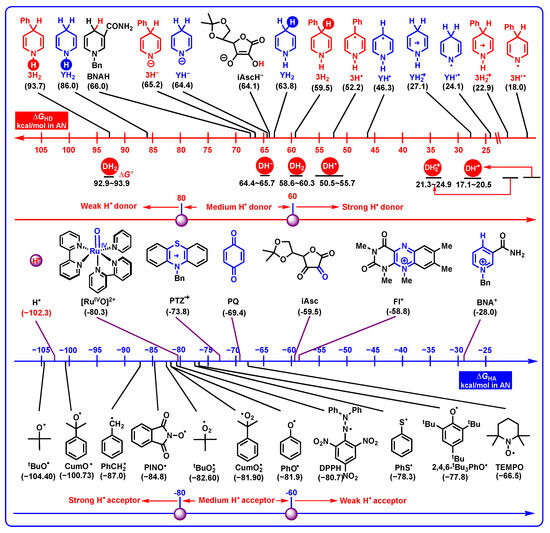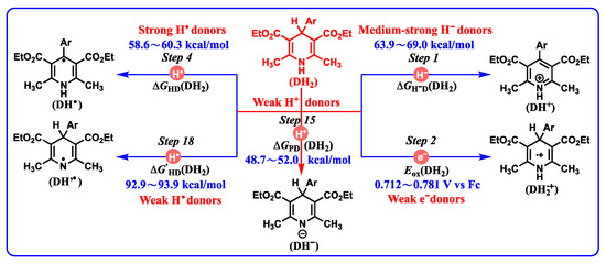 Due to the N-H bond and C-H bond at the 1-position and 4-position of DH2, there are six possible elementary steps to release hydrogen atoms during the aromatization. Herein, the thermodynamic hydrogen-atom-donating abilities of DH2, DH−, DH2•+, DH•, and DH’•, as well as the hydrogen-atom affinities of 12 common radicals (involving H•, tBuO•, CumO•, PhCH2•, PINO•, tBuO2•, CumO2•, PhO•, DPPH, PhS•, 2,4,6-tBu3PhO•, and TEMPO) [29] and coenzyme models (BNA+ for NADH coenzyme, PQ for coenzyme Q, iAsc for oxidated ascorbic acid, Fl+ for flavin coenzyme, and RuIVO2+ for heme enzyme) in acetonitrile are shown in Figure 7.