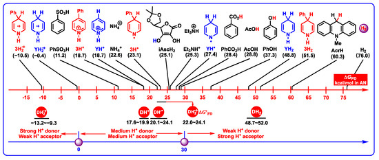 In order to better understand the acidities of DH2 and related active intermediates, the thermodynamic proton-donating abilities of DH2, DH+, DH2•+, and DH’•, as well as the proton-donating abilities of common acids (PhSO3H, iAscH2, Et3NH+, PhCO2H, AcOH, AcrH, and H2) [43,44,45] in acetonitrile are presented in Figure 8.