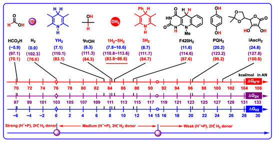 Thermodynamic abilities of DH2 and common hydrogen carriers releasing two hydrogen ions (H− + H+) in the red brackets, releasing two hydrogen atoms (2H•) in the purple brackets, and releasing H2 in the blue brackets in acetonitrile (kcal/mol).