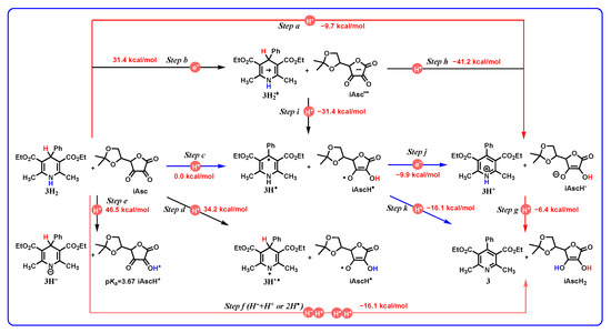 Additionally, the Gibbs free energies of direct hydride transfer from 3H2 to iAsc and proton transfer from 3H+ to iAscH−, Step a (hydride transfer, −9.7 kcal/mol) and Step g (proton transfer, −6.4 kcal/mol), are much less than zero, and it can be inferred that the oxidation process of 3H2 and iAsc undergoing successive hydride (Step a, −9.7 kcal/mol) and proton transfer (Step g, −6.4 kcal/mol) is thermodynamically feasible.