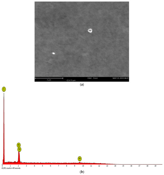 The gold nanoparticles for the AuNP-MCM seen in the TEM micrograph of Figure 1 vary greatly in diameter, but the particle specifically observed in Figure 1d under a smaller scale has a diameter of 20 nm. The SEM/EDS analysis in Figure 2a,b shows the gold nanoparticles on the mesoporous carbon with the gold concentration of 8.54% and carbon concentration of 10.73%. Figure 1b and Figure 2a also show that the gold nanoparticles are evenly distributed on the MCM backbone.