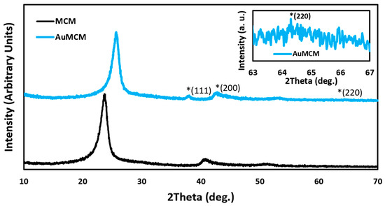 P-XRD spectra for the MCM and AuNP-MCM. The asterisks highlight the location of important peaks.