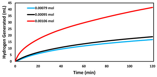 Figure 4 shows the catalytic ability of AuNP-MCM at different reactant concentrations. The catalyzed reaction achieved the highest hydrogen generated rate of 0.0346 mL min−1 mg−1 at 1057 µmol, while the reaction achieved the lowest rate of 0.0140 mL min−1 mg−1 at 793 µmol. At the concentration of 952 µmol, the reaction rate was 0.0159 mL min−1 mg−1. The hydrogen generated rate increased as the concentration of NaBH4 increased. The increase in the reactant concentration shifted the equilibrium of Equation (1) and led to the formation of more products [3,29].