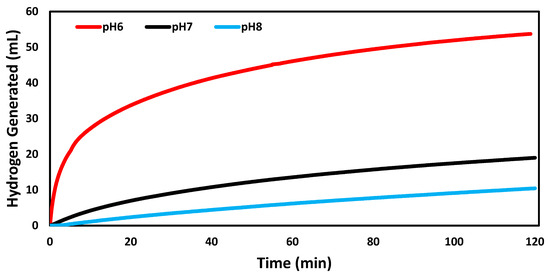 The effect of pH on the catalyzed reactions was indicated in Figure 5. The reaction rate at pH 6 (0.0447 mL min−1 mg−1) was higher than that of pH 7 (0.0159 mL min−1 mg−1). The lowest reaction rate was 0.0087 mL min−1 mg−1 at pH 8. It had been stated in a previous kinetic study of sodium borohydride hydrolysis that the rate becomes lower as the pH increase due to the inhibition effect of OH− [29]. The free proton at low pH condition accelerated the hydrolysis process [29].