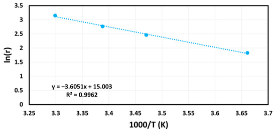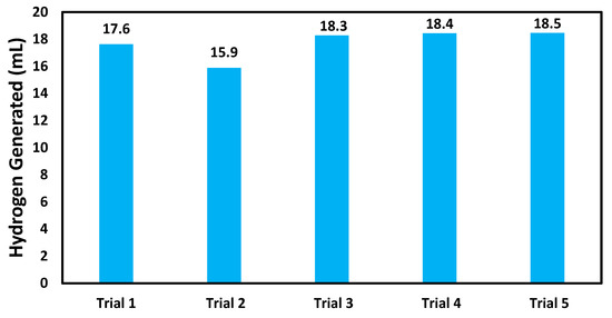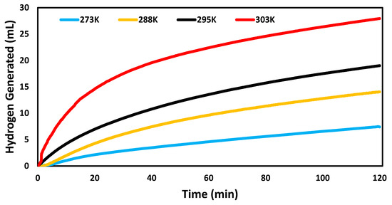 Figure 6 shows that the reaction rate of catalyzed hydrogen evolution reaction improved at higher temperature. The hydrogen generation rates were 0.0062 mL min−1 mg−1, 0.0117 mL min−1 mg−1, 0.0159 mL min−1 mg−1, and 0.0232 mL min−1 mg−1 at 273 K, 288 K, 295 K, and 303 K, respectively. The same pattern was observed in other studies [3,4,29].