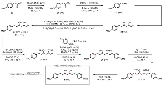 Our new strategy began with the conversion of commercially available 4-methoxyphenylacetic acid 20 to the corresponding methyl ester 21 (94% yield). Carefully controlling the reduction of 21, following a procedure reported by Tao using DIBAL-H [32], enabled the selective reduction of the ester moiety to the corresponding aldehyde 11 in 89% yield. Next, the key Horner–Witting reaction of 11 with chiral building block 7 furnished β-hydroxy-ketone 22 in 85% yield. Subsequent anti-reduction under Evans–Tishchenko conditions and deprotection afforded anti-1,3-diol 23 in high yields (80%) and high stereoselectivity (d.r. > 20:1). Protection of the 1,3-diol motif using tert-butyldimethylsilylchloride (TBSCl) and imidazole furnished the corresponding bis-TBS-protected species 24 in 95% yield. The latter was then subjected to Pd-catalyzed Heck cross coupling with iodide 25 following a modified procedure reported by Kalesse [33]. Gratifyingly, the reaction proceeded smoothly, affording compound 26 in 84% yield. Subsequent hydrogenation of the alkene motif in 26 using 10 mol% Pd/C under 1.0 bar of hydrogen afforded the corresponding alkane 27 in nearly quantitative yields (93%). Finally, deprotection of the silyl ethers with HF·pyridine complex [34] afforded 4 in excellent yields (87%), thus intercepting the synthetic route for the preparation of (+)-hannokinol (1) reported by Yadav and coworkers [11].