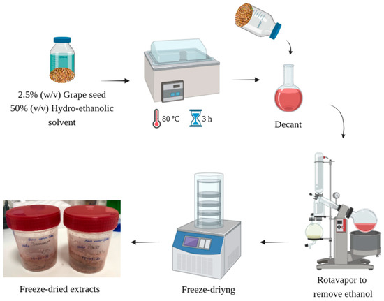The GSE was obtained as described by Bucić-Kojić et al. [29], with some modifications. Briefly, milled grape seeds were subjected to a solid–liquid extraction process using a hydro-ethanolic solvent (1:1 (v v−1)) at a 1:40 (w v−1) ratio. The process was carried out in a shaking water bath (Shaking Bath UNITRONIC VAIVÉN, JP SELECTA, Barcelona, Spain) for 3 h at 80 °C. After extraction, the mixture was decanted for solid–liquid separation, and the ethanol in the supernatant was evaporated using an R-210 Rotavapor System (Rotary Evaporator BÜCHI R-210, Flawil, Switzerland). Finally, the resultant supernatant was frozen at −80 °C and then lyophilized (GAMMA 2–16 LSC plus, Christ, Osterode am Harz, Germany). A schematic representation of the extraction process is shown in Figure 1.