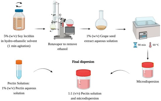 Microdispersions were prepared by the lipid film hydration method, as described by Machado et al. [36]. Briefly, lecithin (Alfa Aesar, Haverhill, MA, USA) was solubilized in absolute ethanol at a 1:20 (w/v) ratio, and the mixture was stirred for 1 min. Then, an R-210 Rotavapor System (Rotary Evaporator BÜCHI R-210, Flawil, Switzerland) was used to evaporate the ethanol until a lipid film was observed on the flask walls. Then, 0.2 g of GSE-Ov and 20 mL of dH2O (for a loaded microdispersion), or just 20 mL of dH2O (for an empty microdispersion), were added to the flask, and the mixture was left in a shaking water bath at 60 °C for 90 min. Finally, 1% (w v−1) pectin aqueous solution was mixed with the microdispersion in a 1:1 (v v−1) ratio to enhance its stability (adjust the electrical charge). A schematic representation of the encapsulation process is shown in Figure 2.