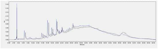 As discussed earlier, phenolic compounds are secondary plant metabolites (e.g., derived from grapevines) that exhibit several biological properties of relevance, such as antimicrobial, antioxidant, and anti-inflammatory activities; therefore, they show great potential for cosmetic applications. In this line, both GSEs were analysed by HPLC for individual polyphenol identification. In total, four different compounds were identified from the chromatograms (Figure 3). The most predominant compounds were those at a wavelength of 280 nm; therefore, the remaining wavelengths studied (320, 360 and 528 nm) are presented in Supplementary Figure S1.