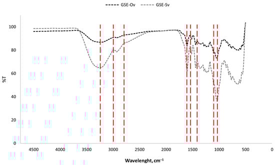 Under Fourier Transform Infrared (FTIR) spectroscopy, each substance has a unique spectrum fingerprint that differentiates it from other compounds [50]. The results of the FTIR analysis of the GSEs are presented in Figure 4.