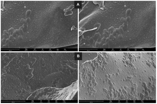 For microdispersion morphology, a scanning electron microscopy (SEM) analysis was performed, and the images are presented in Figure 6. In all pictures, near spherical-shaped and regular microdispersion particles can be seen, in addition to some agglomerates. Also, some size heterogeneity is observed, associated with the microdispersion development process. The agglomerates seem to be formed out of larger microdispersion particles. Also, it has been reported that sample preparation for SEM analysis may be responsible for the formation of some agglomerates [65]. The results were similar for the powdered (Figure 6A) and splintered (Figure 6B) lyophilized GSE-Ov-loaded microdispersions.