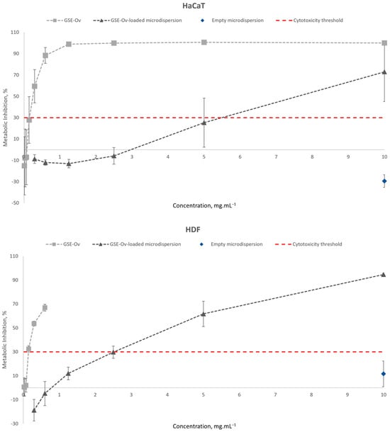 The cytotoxicity of GSE-Ov, encapsulated GSE-Ov, and the encapsulant was assessed through the PrestoBlue™ Cell Viability test (Thermo Fisher Scientific), as specified by the manufacturer. HaCaT and HDF cells were seeded at 1.0 × 105 cells mL−1 in 96 well microplates and left to adhere in incubation overnight. Then, the cells were exposed to GSE-Ov or encapsulated GSE-Ov in serial dilutions starting at 10 mg mL−1, or encapsulant at 10 mg mL−1, for 24 h at 37 °C with 5% CO2 in a humidified environment using DMEM. Concisely, 90 µL of the sample and culture medium for the positive control or 10% dimethyl sulfoxide (DMSO, Sigma Aldrich) for the negative control were added to each well. In two separate studies, each sample was evaluated in quadruplicate.