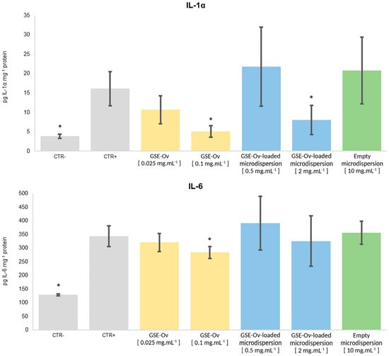 HaCaT cells were seeded at 2.5 × 105 cells mL−1 in 12 well (1 mL per well) microplates for 24 h. Then, the cells were exposed to GSE-Ov, encapsulated GSE-Ov, or the encapsulant at the following concentrations: 0.1 and 0.025 mg mL−1, 2 and 0.5 mg mL−1, and 10 mg mL−1, respectively. The microplate was left to incubate for 24 h in the conditions mentioned above. Briefly, the culture medium was used as a control, and SRM 1648 Urban Particulate Matter obtained from the NIST (Gaithersburg, ML, USA) was used as an inflammatory stimulus. Each sample was evaluated in duplicate, in two independent studies.
