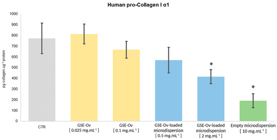 Advanced delivery systems, at the nano- and/or micro-scales, offer several advantages for the administration of specific compounds. These personalized systems protect the encapsulated compounds, preventing their degradation, and can transport and release them more effectively on the targeted tissues. Herein, microdispersions are the chosen system because of their lipid character and their perfect interaction with the skin and its ceramides, which are one of the main groups of skin lipids and play a vital role in its barrier function [54]. For these reasons, we aimed to develop a microdispersion system capable of efficiently entrapping and delivering GSE-Ov, the extract that demonstrated the best phenolic compound profile and biological properties, to the skin.