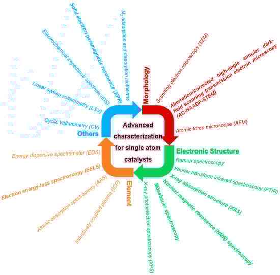 Determining the existence of isolated single atoms and their spatial distribution is the key to developing superior SACs [33,34,35,36,37]. Currently, the characterization methods of SACs are mainly divided into electron microscopy and spectroscopy, among which the spectroscopy mainly includes X-ray absorption near edge spectroscopy (XANES) and extended X-ray absorption fine structure spectroscopy (EXAFS), infrared spectroscopy and nuclear magnetic resonance (NMR) [38,39,40]. The most straightforward and convincing approach is to use electron microscopy techniques such as scanning tunneling microscope (STM) and atomic spherical correction electron microscopy (ACEM) to directly image individual atoms dispersed on the surface of a carrier with a high specific surface area. Moreover, XANES and EXAFS spectroscopy can also provide information on the dispersion and oxidation states of single atoms. In addition, by using suitable probe molecules (such as CO, NH3, and pyridine), infrared spectroscopy can also be used to assess the presence of individual metal atoms and, to a certain extent, quantify the percentage of individual metal atoms dispersed on the surface of the carrier [41,42]. In addition, the changes of the SACs in the catalytic reaction process, the proof of the actual active site, and the elucidation of the catalytic reaction mechanism have not been deeply understood [43,44]. The analysis of single atomic catalytic reaction mechanisms using theoretical calculation has been widely used [45,46]. Therefore, it is urgent to systematically summarize the advanced characterization methods and the theoretical calculation analysis of SACs reported so far.