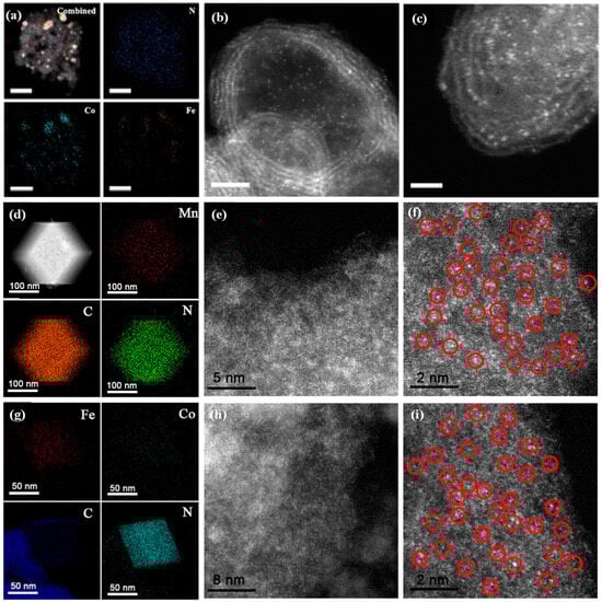 (a) EDX mappings and (b,c) HAADF-STEM images of FeCo-NC-2. Scale bars: (a) 50 nm, (b) 2 nm, and (c) 1 nm. Reproduced with permission [56]. Copyright 2018, American Chemical Society. (d) Element mapping images and (e,f) HAADF-STEM images of the Mn-ISAs@CN, red circles represent individual dispersed metal atoms. Reproduced with permission [57]. Copyright 2020, Elsevier. (g) Element mapping images, and (h,i) HAADF-STEM images of the FeCo@NC-1, red circles represent individual dispersed metal atoms. Reproduced with permission [58]. Copyright 2020, Elsevier, The Netherlands.
