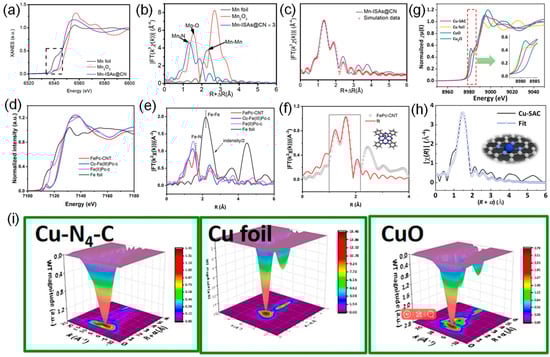 X-ray absorption spectroscopy (XAS) is a widely used technology to determine the electronic structure of catalysts, especially accurately probing the size, coordination environment, and chemical form of single atoms in SACs structure [54,59,60]. The XAS characterization is usually performed at the synchrotron radiation sources, which provide intense and tunable X-ray beams. X-ray absorption fine-structure spectroscopy (XAFS) is associated with the excitation process of core electrons of the X-ray absorbing atom [61]. XAS can be divided into three regions: pre-edge region, near-edge region (i.e., XANES), and post-edge region (i.e., EXAFS) [62,63,64,65]. XANES and EXAFS are the most commonly used XAS characterization techniques. The XANES region, which results from the excitation of core electrons to the valence and conduction bands, can provide information about the electronic valence state and characteristics of concerned elements [4,66]. While the EXAFS region, originating from the scattering interactions of photoelectrons with the neighboring atoms, can provide vital information on the identity of nearest-neighboring elements, coordination values, and interatomic bond distances [61,62,66]. To date, XAS gradually plays a pivotal role among various materials characterization techniques with the development of synchrotron radiation sources. For instance, monitored with XAS measurements, the dominant coordination mode of the Zn-N4 site in hollow porous carbon (HPC) derived from ZIF-8 was studied by Yang et al. [67]. XANES spectra illustrated that the average oxidation state of Zn species was probably situated between Zn0 and Zn2+ (close to Zn2+). Moreover, the fingerprinting signal peaks of Zn-Zn interactions were not observed in the profile of HPC-800 in EXAFS spectra, revealing the atomic dispersion of Zn in HPC-800. EXAFS spectra further verified that the Zn-N4 was the dominant coordination mode of Zn atoms in HPC-800. Analogously, Yang et al. found that Mn-ISAs@CN is between those of the Mn foil and the Mn2O3, implying that the atomically dispersed Mn species carried positive charges (Figure 3a). The EXAFS spectrum of Mn-ISAs@CN exhibits a stronger peak at about 1.3 Å, originating from the shell of Mn-N scattering, indicating the presence of an isolated single Mn atom (Figure 3b). The corresponding fitting results reveal that the first shell coordination number of the single Mn atoms in the Mn-ISAs@CN is four (Figure 3c). In addition, Zeng et al. found that the valence state of Fe in FePc-CNT was close to 3+ in XANES spectra (Figure 3d) [68]. The k3-weighted Fourier-transform spectra of the Fe K edge EXAFS further confirmed that single Fe atoms with a FeN4 configuration were incorporated into FePc-CNT (Figure 3e,f). Furthermore, the Cu K-edge XANES analysis of Cu-SAC showed that the Cu state of Cu-SAC was located between CuO and Cu2O (Figure 3g) [69]. The EXAFS showed that the coordination structure of Cu-SAC was based on Cu-N4-C configuration (Figure 3h). The monatomic dispersion of Cu species is further proved by the wavelet transform spectrum (Figure 3i). The advantages of XAS derive from the extremely high resolution and accuracy, and as a non-destructive characterization, it allows the acquisition of the required information without destroying the original structure of the catalyst. XAS can also be used for in situ testing to analyze changes in elemental valence and structure during catalytic reactions. However, to obtain high-quality XAS data, fine sample preparation and processing are required, including controlling factors, such as sample purity, morphology, and size. Furthermore, XAS is sensitive to experimental conditions (e.g., temperature, pressure, atmosphere, etc.), and therefore, experiments need to be performed to avoid these conditions interfering with the experimental results.