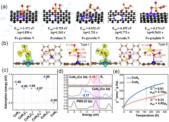 Radicals (•OH and SO4•–) and nonradicals species (catalyst-mediated electron transfer mechanism, high-valent metal, and 1O2) are usually present in reactive oxygen species (ROS) in PMS-based SAC catalysts [49,104,105,106,107]. The adsorption and subsequent bond breaking of PMS molecules can be analyzed by theoretical calculations, and the reaction mechanism can be further explained. Zhang et al. performed DFT calculations to explore PMS adsorption on the possible catalytic sites [108]. Figure 5a shows that the adsorption energies on Fe–pyridinic N4–C, pyridinic N–C, Fe–pyrrolic N4–C, pyrrolic N–C, and Fe–graphitic N4–C were calculated to be −1.471, −0.729, −0.932, −0.455, and −0.174 eV, respectively. The O–O bond lengths (lO–O) in PMS were 1.562, 1.438, and 1.490 Å after adsorbing on the Fe–pyridinic N4–C, Fe–pyrrolic N4–C, and Fe–graphitic N4–C, respectively, which were elongated compared with original PMS molecules (1.410 Å). The results indicate that Fe–pyridinic N4–C interacts more strongly with HSO5− compared with other configuration models due to the more considerable adsorption energy and longer O–O bond length. Chu et al. demonstrated the critical role of the transfer of delocalized π-electrons in tetrapyridomacrocyclic (TPML) in facilitating O–O bond cleavage and stabilizing the surface-bound •OH [109]. The difference-charge and Bader-charge analyses were performed on two possible adsorption configurations: coordinating the Co atom with the O atom adjacent to the H atom (Type I adsorption) or the O atom adjacent to the S atom (Type II adsorption) of O–O bond (Figure 5b). A strong charge transfer from Co-TPML to PMS occurs via Type I adsorption configuration, elongating the O–O bond to 2.01 Å and enabling spontaneous dissociation of O–O bond to surface-bound •OH and free SO4•– species. In contrast to Type I adsorption, while strong adsorption of PMS on Co via Type II configuration also occurs, the charge transfer is minor, and the O–O bond of PMS is slightly elongated from 1.44 to 1.46 Å, indicating that the PMS–Co interaction via Type II adsorption configuration is insufficient for direct O–O bond dissociation. In addition, Song et al. designed unsaturated coordination of a single-atom Co-N3 catalyst in contrast to a conventional Co-N4 catalyst for the activation of PMS [110]. The DFT results showed that the unsaturated coordination model containing N vacancies (Co-N3) has more vital adsorption energy compared to the saturated coordination model (Co-N4, Co-N3C1, Co-N2C2, and Co-N1C3) (Figure 5c). The higher overlap between Co 3d and O 2p near the Fermi energy level, the narrower gap between the d-band center and the Fermi level, and the higher spin state indicated the strong interaction between the Co center and PMS and the enhanced adsorption capacity of the active center (Figure 5d,e).