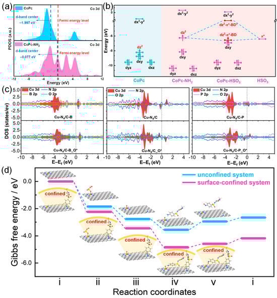Recently, our group employed DFT to illustrate the effects of model catalysts with different electronic structures on the activation of PMS [72]. As displayed in Figure 6a, compared to CoPc/G, the Co 3d d-band center in CoPc/G-NH2 shifted positively from −1.997 eV to −0.077 eV, which led to a decreased occupancy and enhanced the adsorption strength of PMS. Additionally, the closer proximity of the d-band center to the Fermi level accelerated charge transfer at the reaction interface, thereby lowering both the free energy barrier and activation energy. Moreover, as shown in Figure 6b, the molecular orbitals analysis revealed that PMS activation was predominantly governed by the 3dz2 orbital in the Co(II) center and π* from the HSO5 group. The amino ligand modification notably enhanced the dz2 orbital compared to CoPc, which rendered CoPc-NH2 more prone to electron donation, consequently facilitating PMS activation. In addition, Zhou et al. integrate electron-deficient boron (B) or electron-rich phosphorus (P) heteroatoms into carbon substrates to tune the electronic structure of Cu-N4 sites for PMS activation [111]. As shown in Figure 6c, the partial density of states (PDOS) for the Cu centers, heteroatoms in the substrate, and oxygen of PMS adsorbed on the Cu sites were calculated. In apparent contrast to primary Cu-N4/C, the PDOS of Cu sites in Cu-N4/C-B displays a negative shift, indicating a decrease in the d-band center. Comparatively, the PDOS of Cu atoms in Cu-N4/C-P moves toward the opposite direction, with an increased d-band center. Additionally, the PDOS for PMS adsorbed on Cu centers shows that Cu-N4/C-B has a relatively weak interaction with PMS compared to Cu-N4/C. Therefore, heteroatom functionalization can effectively optimize the electronic structure of Cu-N4 sites, boosting the activation of PMS. Furthermore, DFT can also be used to calculate the Gibbs free energy of PMS activation from a thermodynamic point of view [112,113]. FeN4 structures were constructed to obtain single-atom catalysts for generating FeN4=O intermediate [113]. The corresponding energy profiles (surface-confined and unconfined systems) were performed to probe the insights of PMS activation and SMX oxidization mechanism on the FeN4 site (Figure 6d). The results showed that the total energy released at the FeN4 site during the reaction over the surface-confined system is much larger than that of the unconfined system, suggesting that the oxidation of SMX is thermodynamically favorable.