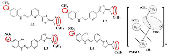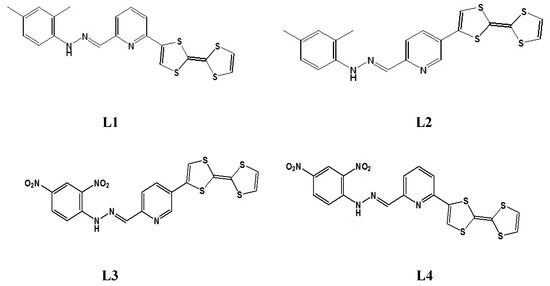 In this work, we present a study of linear and nonlinear optical (NLO) properties of four newly synthesized TTF-appended azine derivatives, namely 2-([2,2′-bi(1,3-dithiolylidene)]-4-yl)-6-((2,4-dimethylphenyl)hydrazono) methyl)pyridine (L1), 5-([2,2′-bi(1,3-dithiolylidene)]-4-yl)-2-((2,4-dimethylphenyl)hydrazono) methyl)pyridine (L2), 5-([2,2′-bi(1,3-dithiolylidene)]-4-yl)-2-((2,4-dinitrophenyl)hydrazono) methyl)pyridine (L3), and 2-([2,2′-bi(1,3-dithioltlidene)]-4-yl)-6-((2,4-dinitrophenyl)hyrdazono) methyl)pyridine (L4), as presented in Figure 2, for developing a hierarchical methodology of computer simulations [16,17]. The investigated molecules are composed of the TTF moiety, acting as the donor part, and dimethylphenylhydrazone (also acting as a donor group) or dinitrophenylhydrazone, acting as an acceptor separated by the azine group, which can also be seen as an acceptor moiety. The great importance is the choice of the π-conjugated spacer playing a crucial role in the efficient electron communication between the donor and the acceptor parts. In our case, it is the pyridine moiety.