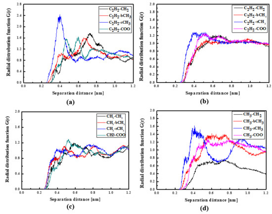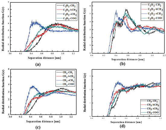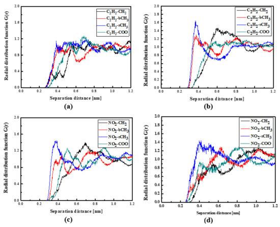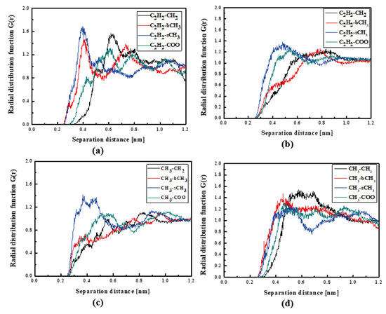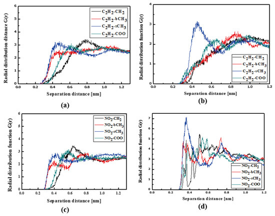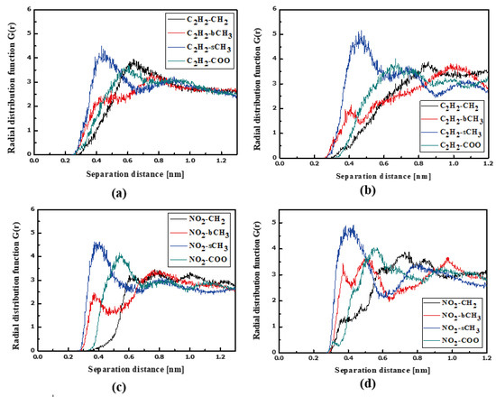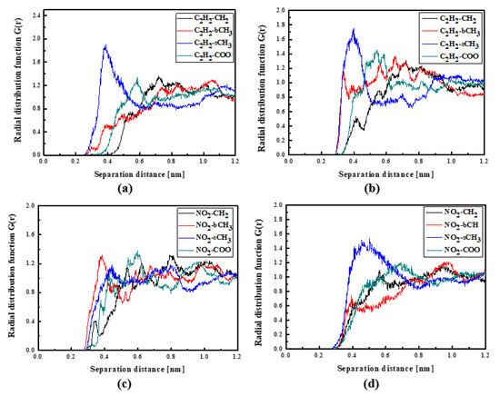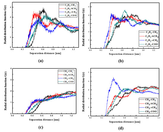 In Figure 4, the RDFs calculated for the L1 chromophore and different groups of PMMA mer in the bulk form are presented. From Figure 4a, one can see that in a liquid state (at 500 K), the distance of C2H2-bCH3 is equal to 0.3 nm. The same distance is noticed for the CH3-bCH3 and CH3-sCH3 (see Figure 4c). It means that at 500 K, the chromophores L1 enter between side mer groups of the PMMA. In the glassy state (at 300 K), both groups of L1 are located close to the sCH3 side groups of the polymer (see Figure 4b,d). It means that the solidification of the L1/PMMA composite twists of the polymer and chromophores come out from between the mers, slightly moving away from them. At 300 K, the free volume around L1 chromophores has a diameter of 0.4 nm. The same distance is obtained for the host–guest polymer systems based on the PMMA matrix doped with different chromophores, namely N,N-dimethylp-nitroaniline (DPNA), 4-(dimethylamino)-4′-nitrostilbene (DMANS), and N,N′-di-n-propyl-2,4-dinitro-1,5-diaminobenzene (DPDNDAB) [29]. This is probably an intrinsic property of the polymer matrix.