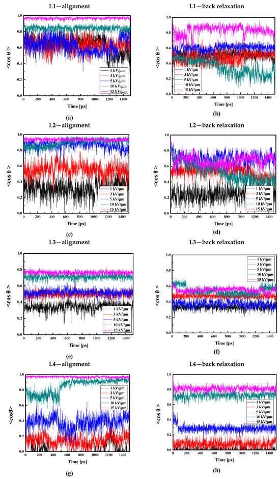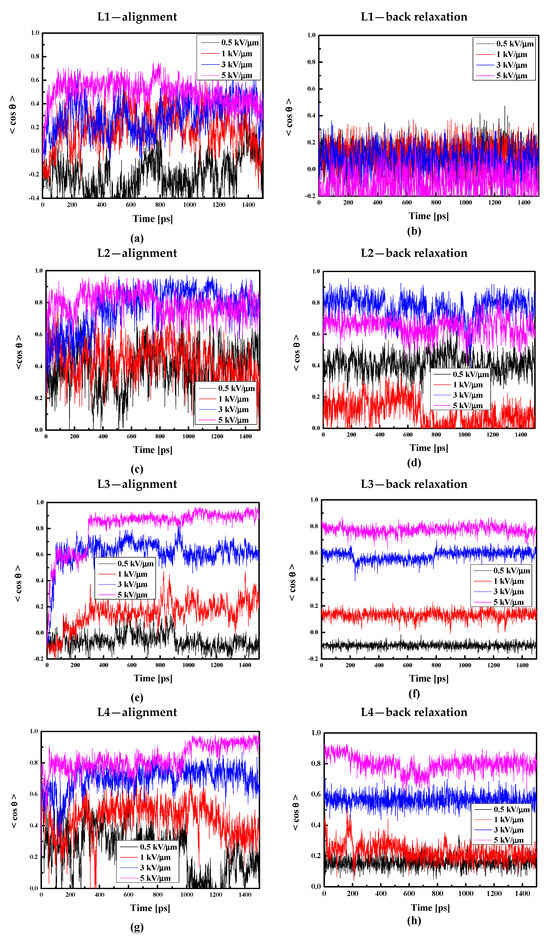 Changes in the value of the order parameter <cosθ(t)> versus the time of simulation and applied external electric field calculated by the MD technique for the L1/PMMA (a,b), L2/PMMA (c,d), L3/PMMA (e,f), and L4/PMMA (g,h) composites in the thin film form at the temperature of 500 K (a,c,e,g) and in glassy state (300 K) after the simulated annealing (b,d,f,h).
