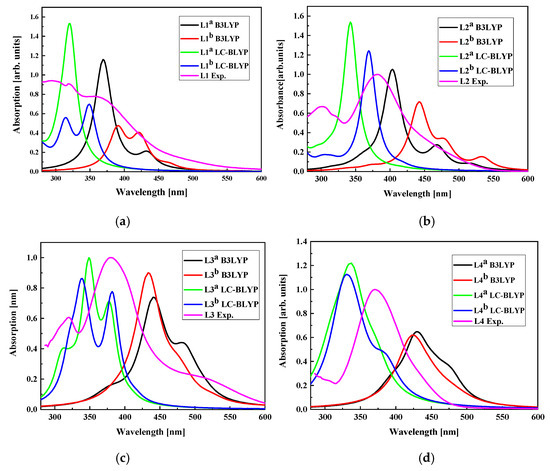 The UV-vis absorption spectra calculated by DFT/B3LYP and DFT/LC-BLYP methods for L1 (a), L2 (b), L3 (c), and L4 (d) molecules in dichloromethane compared with experimentally obtained data. UV-vis absorption spectra of L1, L2, L3, and L4 chromophores measured in dichloromethane (~C = 2.6 × 10−5 M) at room temperature.
