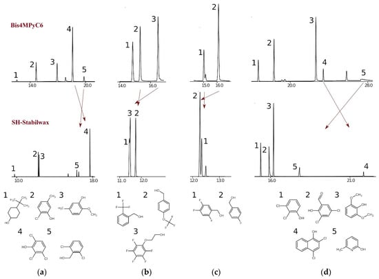 Chromatographic behavior of various analytes on the Bis4MPyC6 IL-based SP compared with the SH-Stabilwax SP. Changes in the retention order are shown by the lines (a–d). The numbers are the order of elution of the compounds.