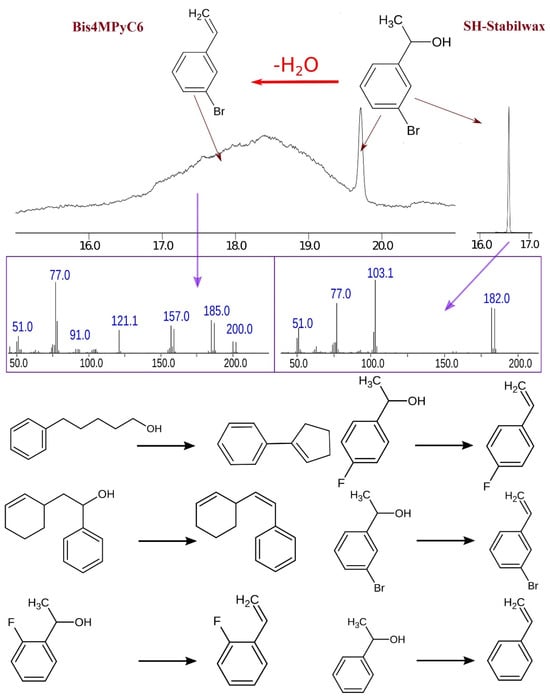 For the IL-based SP, the in-column dehydration is observed for some compounds. For example, 1-(3-bromophenyl)ethanol (C8H9BrO) elutes as two peaks; the first one is very broad and corresponds to 1-bromo-3-vinylbenzene (C8H7Br) when searched in the NIST 17 database, and the second one (sharp narrow peak) corresponds to 1-(3-bromophenyl)ethanol. The same situation is observed for five other substituted derivatives of 1-phenylethanol. One more compound affected by the in-column transformation is 5-phenylpentan-1-ol. This compound undergoes simultaneous dehydration and cyclization, and 1-phenylcyclopentene is formed. Derivatives of 2-phenylethanol and any other compounds do not undergo in-column reactions. All observed in-column transformations are shown in Figure 3. The considered column continues to separate compounds well without significant changes in chromatographic behavior after many months of storage and being in operation.