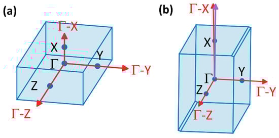 First Brillouin zones of PE (a) and P3HT (b). The high symmetry points X, Y, Z, and Γ are labelled. The paths Γ-X, Γ-Y, and Γ-Z are shown with red arrows and correspond to the phonon band structure paths shown in Section 2.5. In all systems, Γ-Z is parallel to the polymer axis. The Bravais lattice is primitive orthorhombic for PE (and also for PT—not shown here) and primitive monoclinic for P3HT. Thus, in P3HT, the Γ-X direction (red arrow) is slightly inclined relative to the real space direction x (purple arrow).