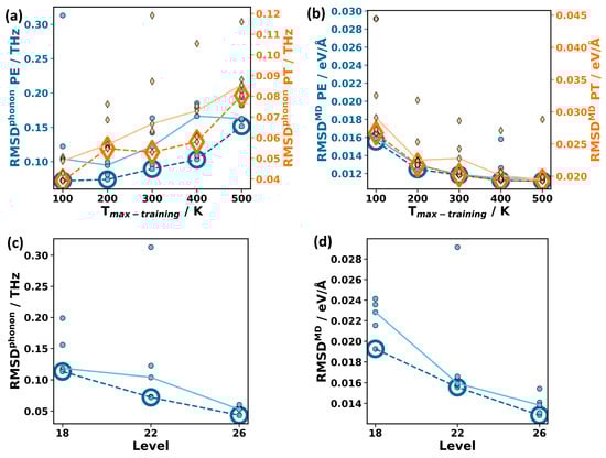 Influence of the training data and the chosen level on the accuracy of MTPs. Accuracy is measured by the root mean square deviation (RMSD) between MTP- and DFT-calculated phonon frequencies sampled in the whole Brillouin zone up to 12.5 THz (RMSDphonon) and by the RMSD of forces on atoms calculated for validation structures generated in a 300 K active learning MD run (RMSDMD). Panels (a,b) show RMSDphonon and RMSDMD for different training data sets for PE (blue) and PT (orange) for the MTP level set to 22. The values on the x-axis denote the maximum temperature in the generation of the respective reference data during active learning runs (for details see main text). Panel (c) shows RMSDphonon for PE for different MTP levels (generated with 15–100 K training data), and panel (d) RMSDMD for PE for different MTP levels (again generated with 15–100 K training data). For each data set/level, five MTPs are parametrized and the associated RMSD values are shown as small, filled symbols. Datapoints for MTPs with median RMSDphonon/RMSDMD are connected by solid lines, while data for the “best” MTPs are denoted by large, dark, open symbols and are connected by dashed lines. The numerical values for these plots are provided in Tables S3–S5 of the Supplementary Materials.