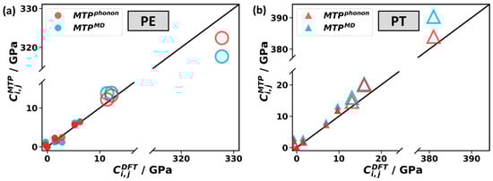 Independent elements of the elastic tensor calculated with MTPMD and MTPphonon compared to the results obtained with DFT. All simulations are performed applying the “clamped ion method” as explained in the main text. The investigated materials are (a) PE and (b) PT. The black line with a slope of 1 indicates perfect agreement between MTP and DFT. The displayed data are obtained with the “best” MTPs as defined at the end of Section 2.2. The large open symbols represent Cxx, Cyy, and Czz, while the small symbols represent the other independent components of the elastic tensor. An analogous plot containing the mean values over elastic constants calculated with all parametrized (typically five) MTPs, and corresponding error bars can be found in Figure S6.